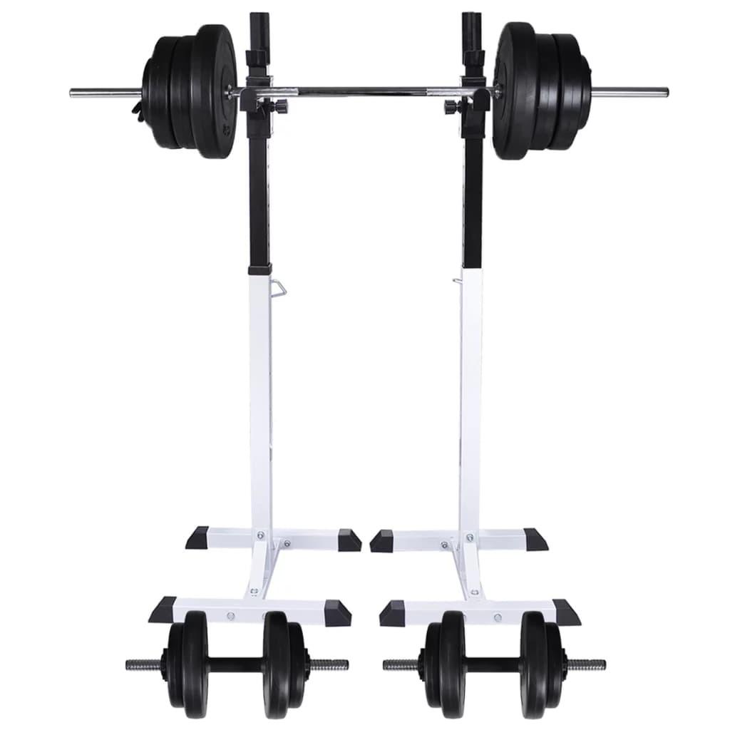Dette robuste og stabile vægtstangs-/squat-stativ med vægtstang og håndvægte er perfekt til træningscentret derhjemme! I kombination med en træningsbænk vil det være velegnet til bænkpres såvel som squats.